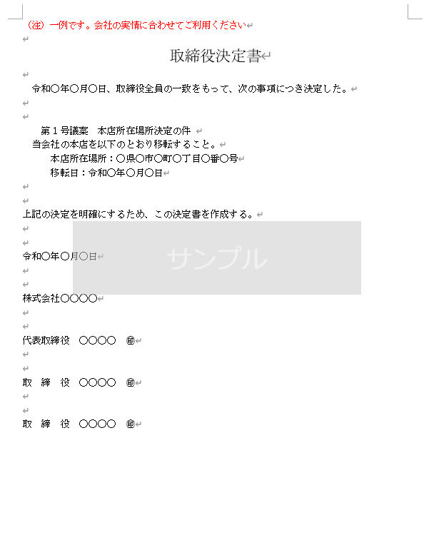 - 本店移転の取締役決定書テンプレートはこちら