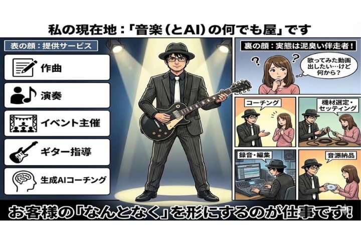現在は、自身の会社として音楽を広く扱うことを目的として活動しています。最初は売上も人脈もない状態でしたが、どこにでも飛び込み人脈を広げ、目の前の仕事に注力することで徐々に案件が増えてきました。 具体的には、動画制作やYouTuber向けの音楽コーチング・技術面からの機材選定サポートなどを行っています。 実績としては、大手玩具メーカーや小売り企業とのお仕事、お笑いコンビ関連のYouTubeのサポート、自治体が主催するミュージカル支援など、多岐にわたります。